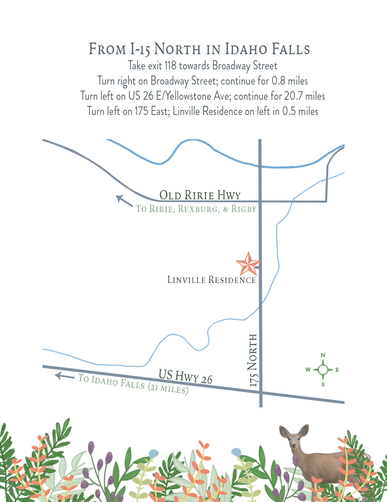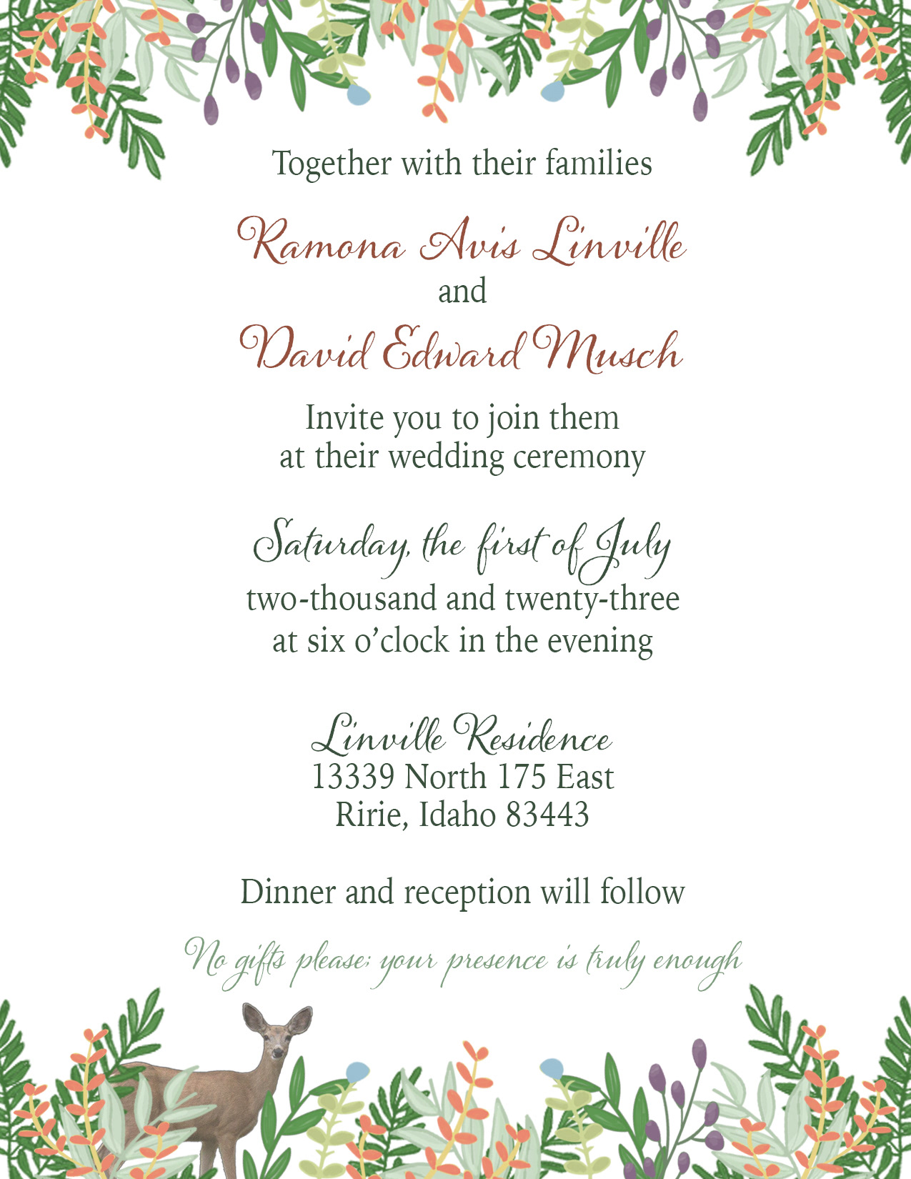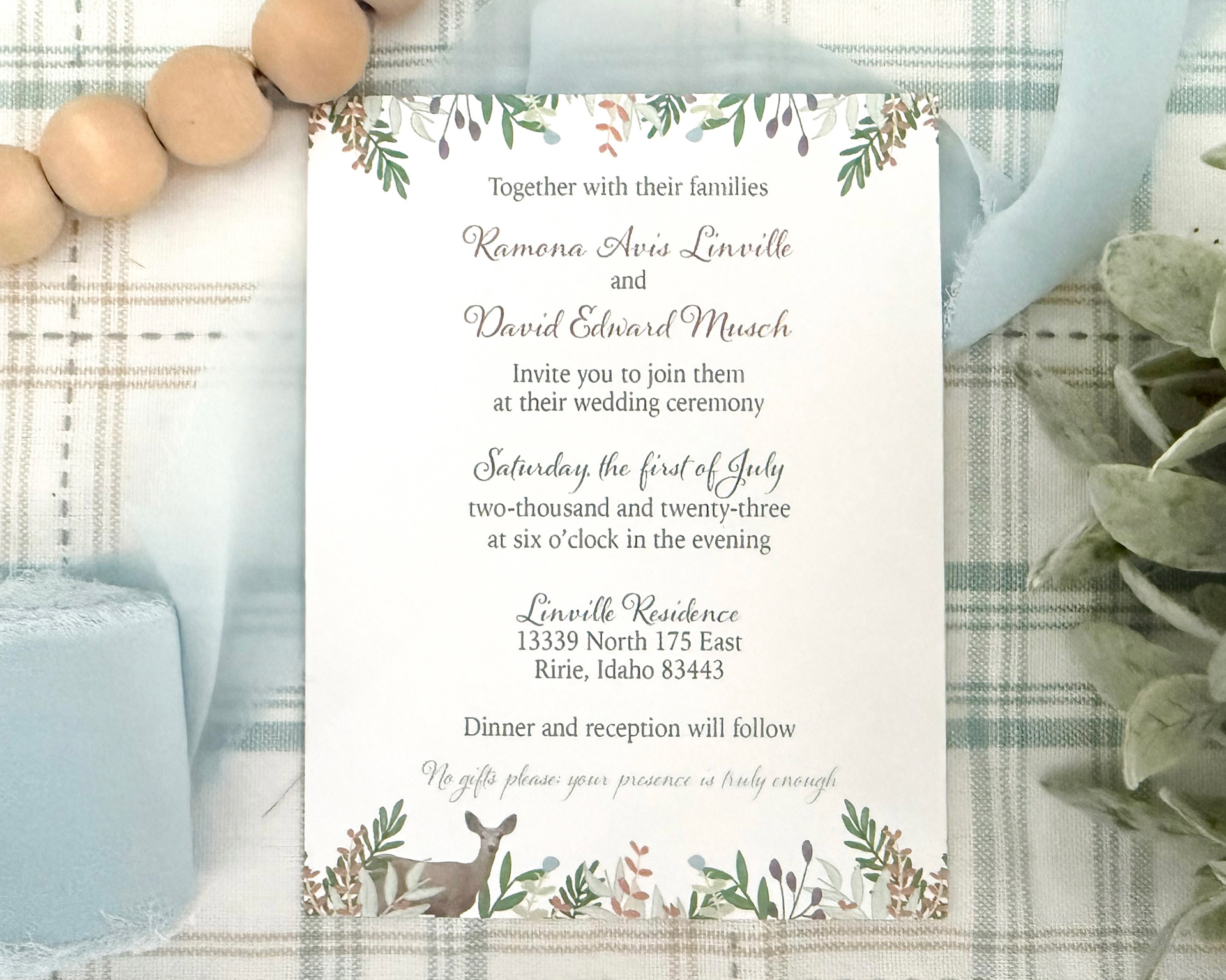 Double sided wedding invitation with botanical sprigs, a watercolor deer, and a custom map
